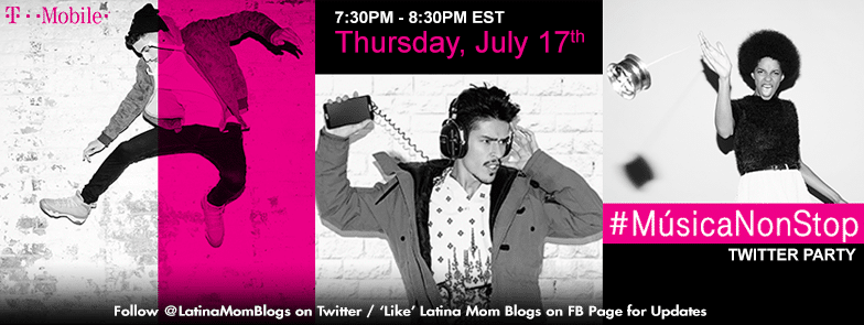 Join TMobile, Lele Pons, David Lopez and Latina Mom Bloggers on Thursday, July 17th at 4:30 pm PST/7:30pm EST for the #MúsicaNonStop Twitter Party. We’ll be chatting about our favorite music, how we keep the music going and getting ready for Premio Juventud.