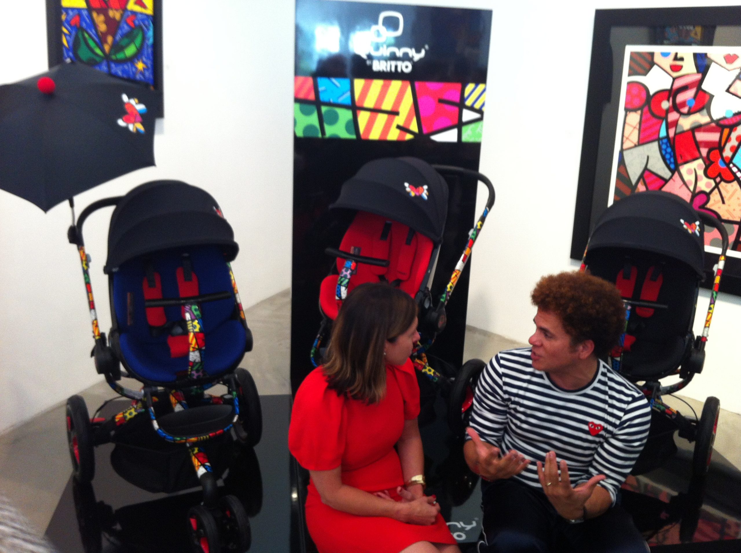 Romero Britto and fashion stylist and mom Pilar Steinborn unveil the Britto Quinny and Maxi-Cosi strollers and car seats at the Britto gallery on Lincoln Road.